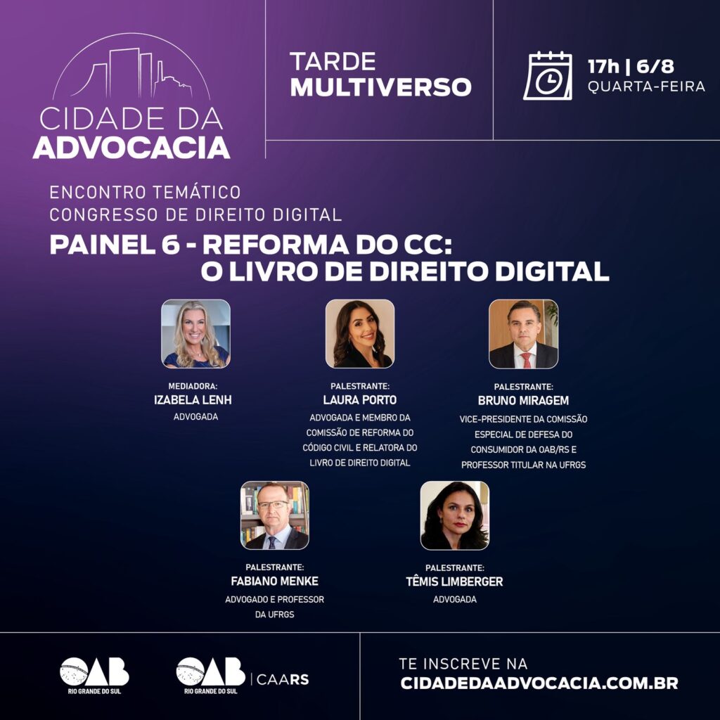 Hoje, 6 de agosto, 17hs, Fabiano Menke participará de discussão, na Cidade da Advocacia, sobre o Livro de Direito Digital que se pretende incluir no Código Civil.